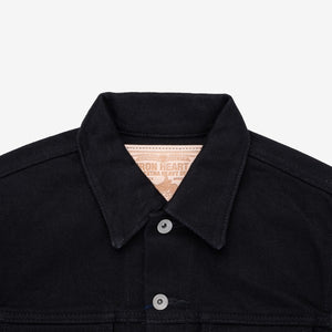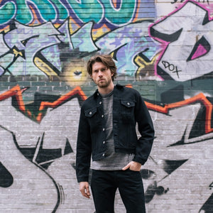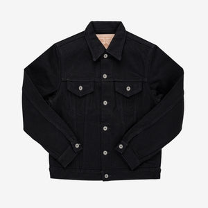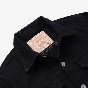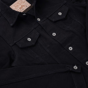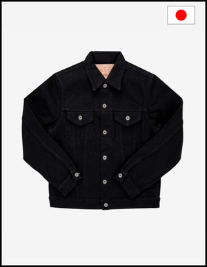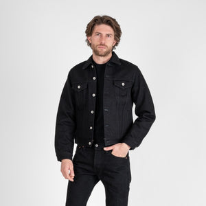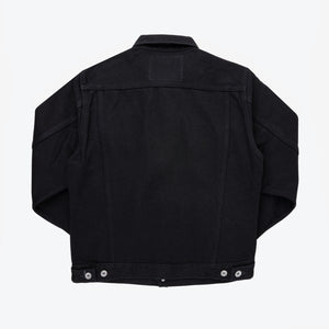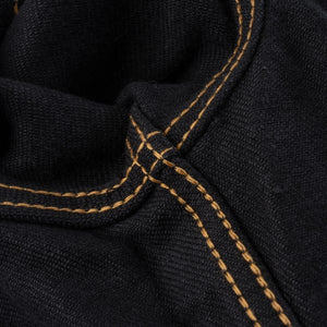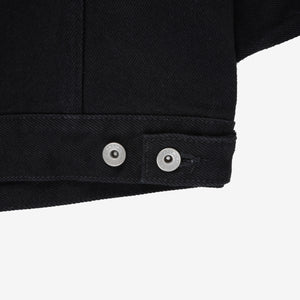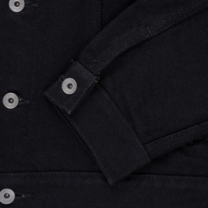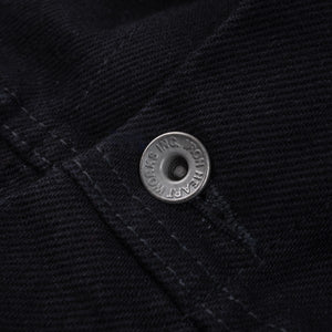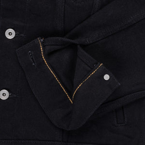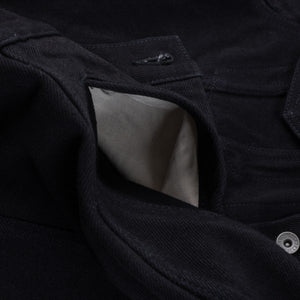 Our modified Type III jacket—complete with handwarmer and internal pockets—made from 21oz "Superblack Fades To Grey" (SBG) selvedge denim. Heavyweight, yet soft and breathable, this variation of our signature denim is woven using a blend of sulphur and reactive dyed yarns. As the fabric ages, the sulphur-dyed warp will slowly fade to grey, while the reactive-dyed weft will retain its jet black tone, resulting in the high contrast fade characteristics that SBG denim is renowned for.