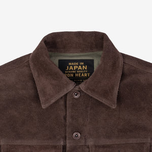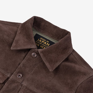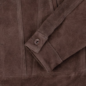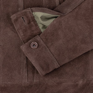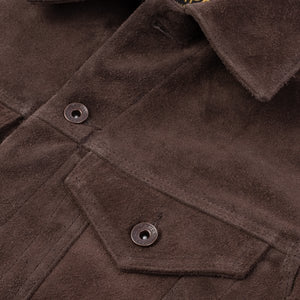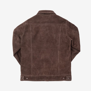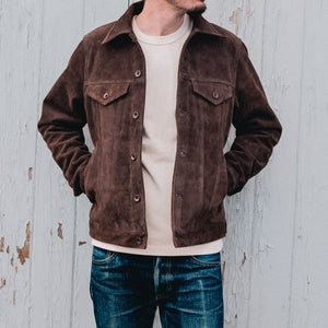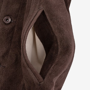 Modified Type III Jacket, made from soft split steer hide rough-out leather by FourSpeed, Japan, to Haraki's design. Modified with a slightly longer body than the original Levi's version, and with the addition of two external hand-warmer pockets, two internal snap fastened "gun" pockets and a cotton twill lining.