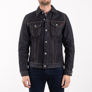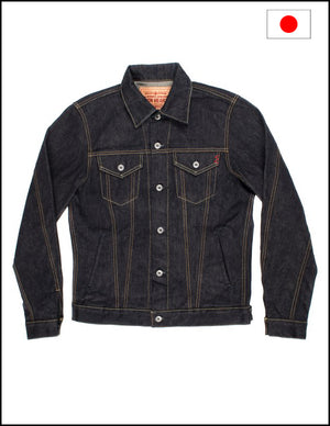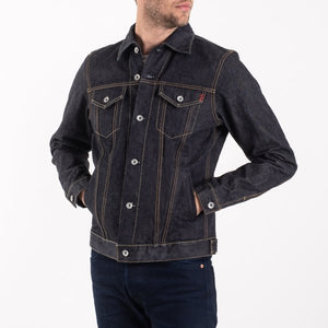 Our classic Type III jacket, modified with a slightly longer than traditional body and with the addition of side handwarmer pockets, made from our 14oz indigo selvedge denim (second version which is made with a double twisted weft yarn, the same construction technique as our 21oz selvedge denim).