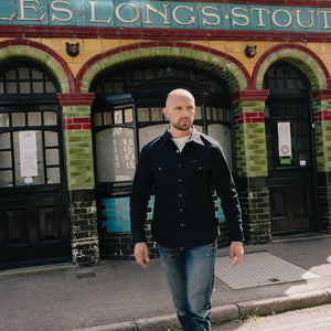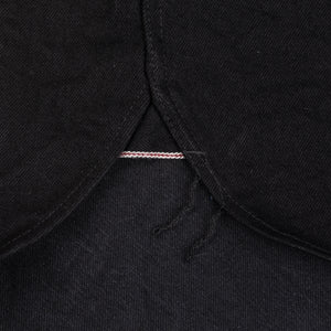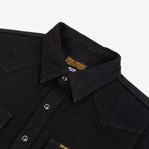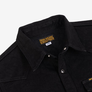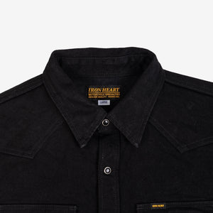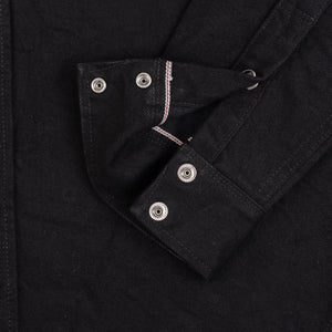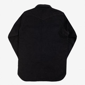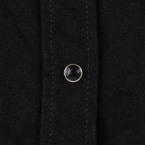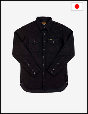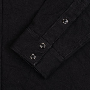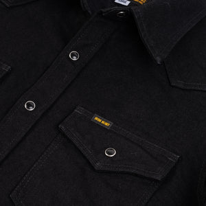 Our western cut shirt made from a 14oz black warp/black weft selvedge denim. The warp is black sulphur rope dyed, the weft is black sulphur dipped. Constructed with black tonal stitching. Will fade to grey.