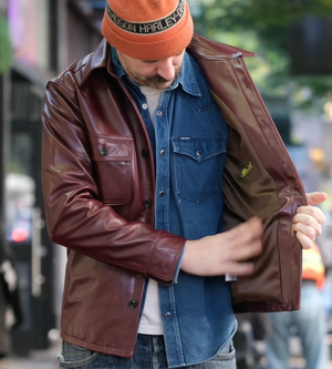 Classic work shirt cut with its flat hem, corozo nut buttons and straight cut back yoke make for ones of the cleanest leather shirts we have seen.
