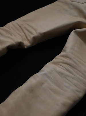Note : because of how UV sensitive this leather is hides may have sections of discolouration due to light exposure. This is completely normal and impossible to avoid. Over time these tan marks will all blend together as the hide tans with wear. The pants will all start out the lighter natural pink colour and with time and uv exposure they will darken. Please be aware of this when placing your order.