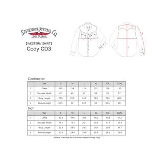 This is an updated version of our standard western shirt, the Cody. It is now more comfortable to wear than the tight silhouette of the past, with more room in the body, shoulders, and neck. It is an original western shirt that has evolved in comfort by reviewing the silhouette and size while keeping the characteristic design such as the front yoke and the wing-shaped back yoke with the image of a buffalo horn.